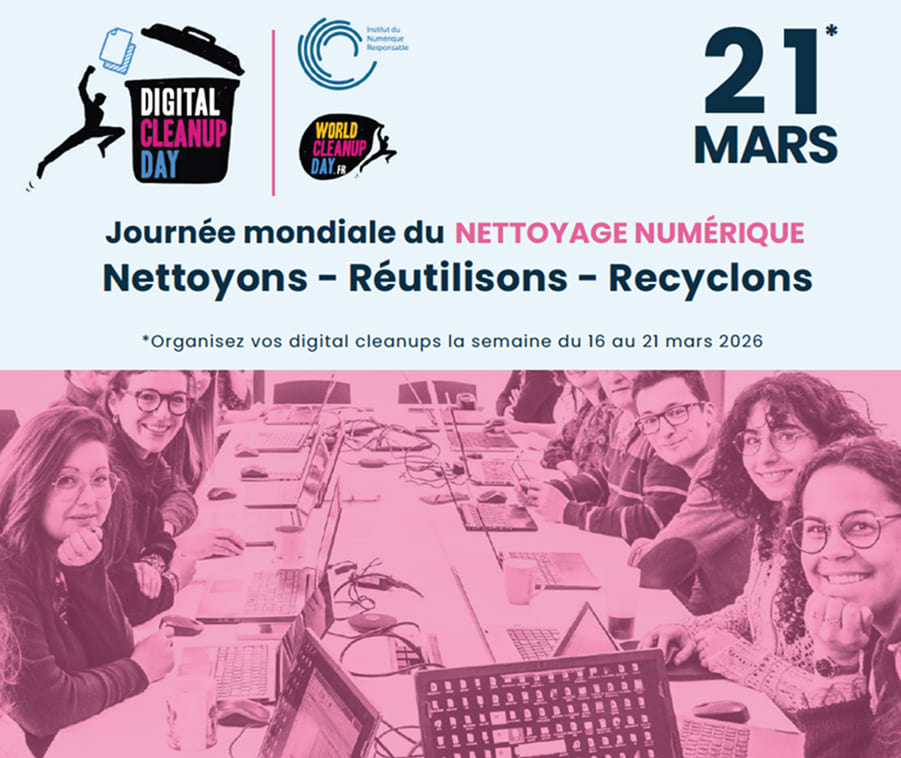 La prochaine et septième édition du Digital Cleanup Day aura lieu le 21 Mars 2026 avec la possibilité, la semaine précédent cette date, d’organiser 4 types de Digital Cleanups : Données, Réemploi, Recyclage et Sensibilisation.